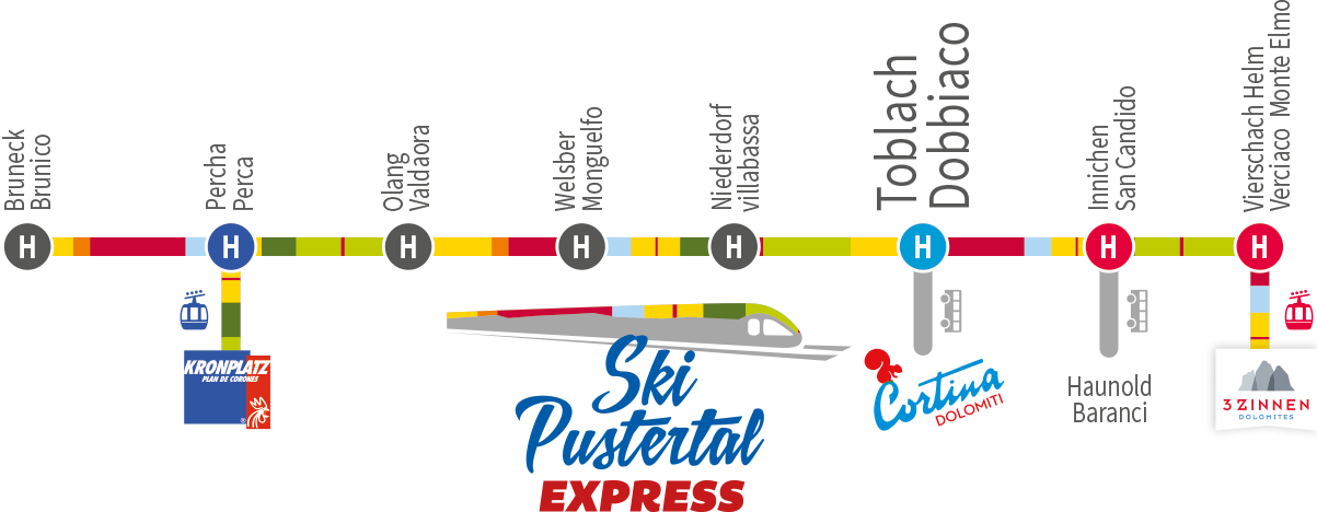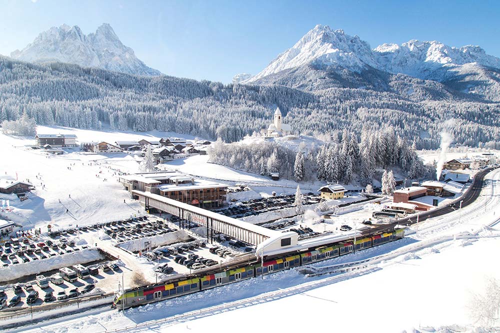 Hop on the Ski Pustertal Express — a train that runs every 30 minutes from Dobbiaco.